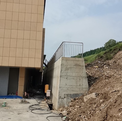 项目位于内蒙古阿尔山市,拟建零碳科技馆展示厅,场地北侧存在长度约60m土质边坡,根据建筑场地面积需求,需要对环境边坡进行垂直支挡。技术团队根据地勘资料,结合周边地势、建筑物楼层高度及出行线路规划等条件,对环境边坡进行支挡设计和截排水设计。从施工可行性、经济性、安全适用性等方面进行综合考虑,采用俯斜式重力式挡土墙进行边坡支挡,支挡结构的实施,既保障了建筑物安全,又将建筑与周边地势进行了无障衔接。