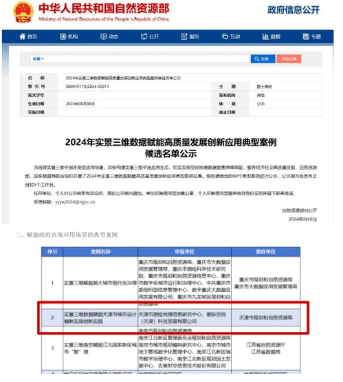 星际公司主持完成了天津市三维数字城市建设,正在开展天津市实景三维建设与应用工作。截至目前,实景三维天津数据已覆盖天津市中心城区及周边重点区域600多平方公里高精细三维数字模型、天津全市域城镇开发边界范围2924平方公里城市三维模型LOD1.3成果。其中,星际公司申报的《实景三维数据赋能天津市城市设计编制实施创新实践》,代表天津实践,成功入选了2024年自然资源部、国家数据局创新应用典型案例,并被自然资源部专题推介研阅。